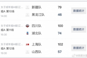 【全运会女篮成年组资格赛第四日综述:上海队大胜山西几乎锁定决赛圈 四川、北京提前锁定决赛圈】今天全运会女篮成年组资格赛继续在江苏南京、辽宁丹东两个赛区进行,其中上海队大胜山西,几乎锁定了决赛圈的资格,四川、北京取得三连胜,提前锁定决赛圈。轮空的山东队已经提前锁定决赛圈资格。